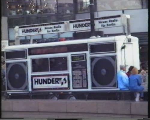 Footage of an overcrowded subway trip at Kurfürstendamm, crowds of pedestrians along Kurfürstendamm, an advertising campaign held by the Kaiser's supermarket chain and East Germans in conversation