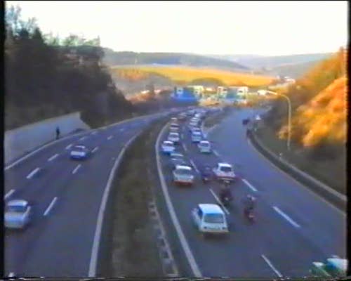 Cheering people and traffic chaos on the A9 freeway, at the Brückenrasthaus roadhouse in Frankenwald and at the newly opened Autobahn border crossing Rudolphstein/Hirschberg, that was installed on 9 November 1989.