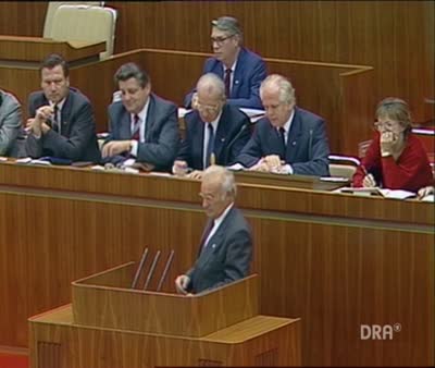 “Live broadcast from the eleventh conference of the Volkskammer (People’s Chamber) with the announcement by Hans Jendretzky of the resignations of the Volkskammer President Horst Sindermann, Vice President Gerald Götting, and all board members of the Volkskammer. / Live broadcast from the eleventh conference of the Volkskammer with the first round of voting for the new president of the Volkskammer of the GDR. / Live broadcast from the eleventh conference of the Volkskammer runoff vote between Manfred Gerlach (Liberal-Demokratische Partei Deutschlands [LDPD; Liberal-Democratic Party of Germany) and Günther Maleuda (Demokratische Bauernpartei Deutschlands [DBD; Democratic Farmers’ Party of Germany) for the presidency of the Volkskammer. Günther Maleuda is elected its new president. / Live broadcast from the eleventh conference of the Volkskammer with the election of the vice president and the members of the board of the Volkskammer of the GDR. Werner Jarowinsky is elected the new vice president of the Volkskammer. / Live broadcast from the eleventh conference of the Volkskammer with statement on the political situation in the GDR. The ministers and members of the Ministerrat (Council of Ministers) Willi Stoph, Ernst Höfner, Gerhard Schürer, and Erich Mielke respond to questions from members of the chamber and try to justify themselves. Quotations from Erich Mielke: ‘Please, that is not just a formal question.’ ‘But I do love everyone …’ Günther Maleuda reads a letter from the members of the Ministerrat with an announcement of the resignation of all members. Hans Modrow is elected the new chairman of the Ministerrat of the GDR.” (Source: DRA)