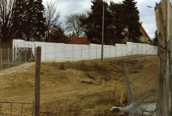 Former border strip; the border patrol road and Hinterlandmauer (inner Eastern wall) in the background