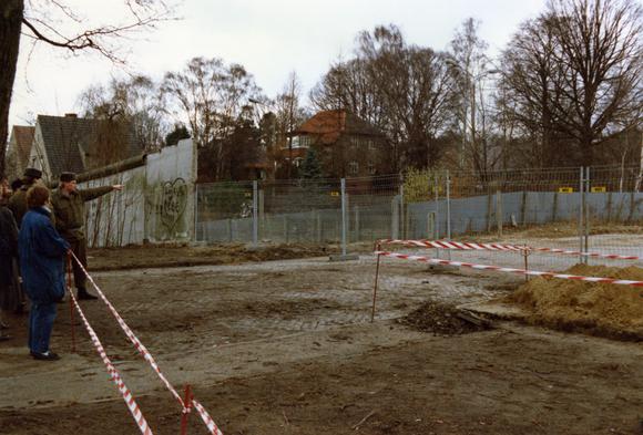 Grenzsoldaten und Passanten im Gespräch, im Hintergrund links die teilweise abgebaute Mauer, rechts die Hinterlandmauer