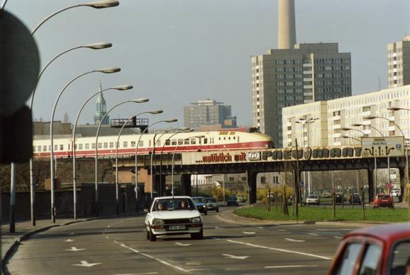 A former Deutsche Reichsbahn diesel-hydraulic LRC train, VT 18.16; the tower of St. Mary's Protestant Church in Karl-Liebknecht Straße and the concrete shaft of the Berlin Television Tower in the background