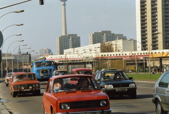 Der dieselhydraulische Schnelltriebzug VT 18.16 der ehemaligen Deutschen Reichsbahn, im Vordergrund die dicht befahrene Holzmarktstraße, im Hintergrund in der Mitte der Betonschaft des Berliner Fernsehturms, links der Turm der evangelischen St. Marienkirche in der Karl-Liebknecht-Straße