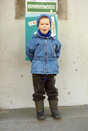 A young boy in front of a wall with two Buendnis 90 (Alliance 90) election posters. Bündnis 90 was an alliance of three non-Communist political groups in East Germany formed in February 1990 by Neues Forum, Demokratie Jetzt and the Initiative Freiheit und Menschenrechte.