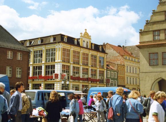 Stalls at the marketplace in Greifswald; the Magnet department store in the background; the townhall to the right