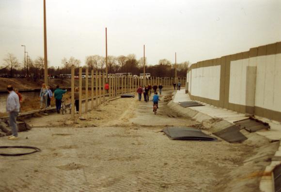 The border strip on Schiffbauerdamm; traces of the already dismantled Wall on the left; the still intact Hinterlandmauer (inner Eastern wall) on the right