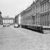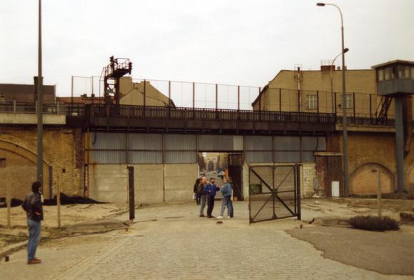 Pedestrians in front of an S-Bahn (city rail) arch and passage; traces of the dismantled Wall in the foreground