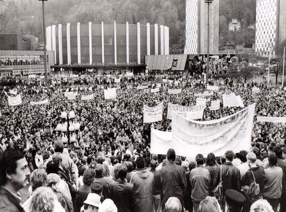 Around 2,500 citizens at a demonstration in the city center of the former district capital Suhl in Thuringia; Stadthalle der Freundschaft (City Hall of Friendship) in the background, now known as Congress Centrum Suhl (congress center)
