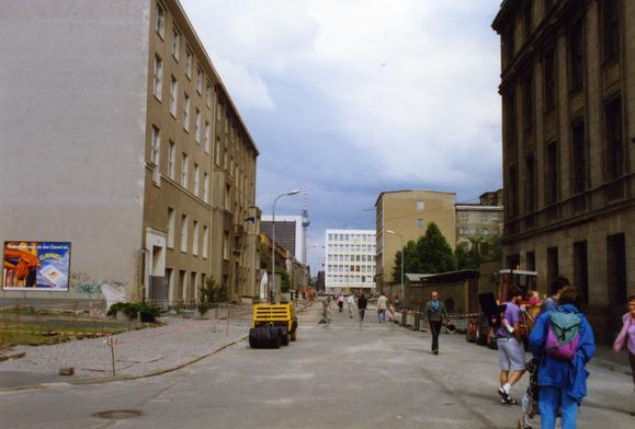 Ein Zaun markiert den Verlauf der bereits abgebauten Hinterlandmauer in der Clara-Zetkin-Straße (heute Dorotheenstraße), im Hintergrund das Internationale Handelszentrum (IHZ) und der Berliner Fernsehturm