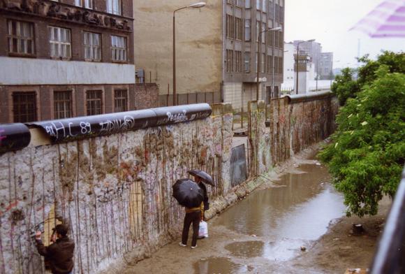 Mauerspechte (Berlin Wall "woodpeckers") at the West side of the Wall that has been chipped at and demolished to its steel reinforcement