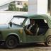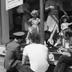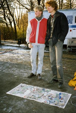 Two young men selling pieces of the Wall; an outside broadcast van in the background