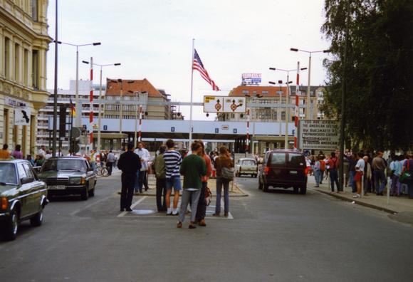 Grenzübergang Friedrichstraße (Checkpoint Charlie) ohne das Wachhaus der westlichen Alliierten, das am 22. Juni 1990 abgerissen wurde und sich heute im Alliiertenmuseum befindet