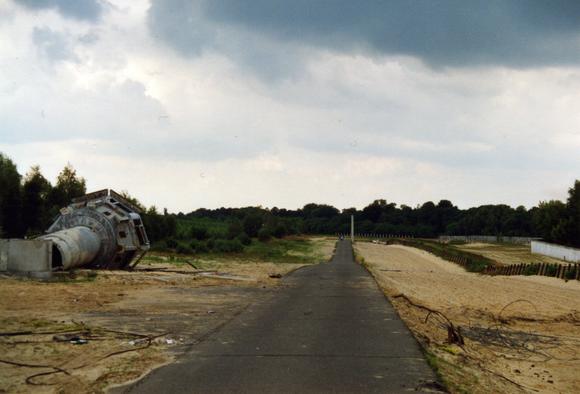 An overturned watchtower in the former border strip near Steinstücken (Wikipedia article, retrieved on January 6, 2010); the partly dismantled Hinterlandmauer (inner Eastern wall) on the right