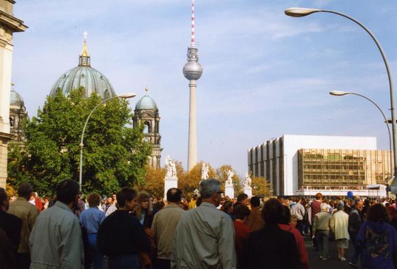 Crowds of people on the boulevard Unter den Linden; the Berliner Dom (Berlin Cathedral), Television Tower, marble sculptures on the Schloßbrücke (bridge) and Palast der Republik (Palace of the Republic) are all in the background