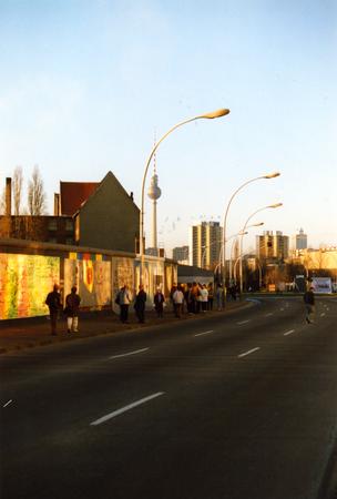 Besucher an einem Teilabschnitt der 1,3 km langen East Side Gallery in Berlin-Friedrichshain, im Hintergrund der Berliner Fernsehturm