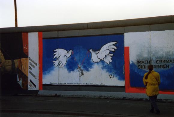 East Side Gallery, Eine Person, Frau, Friedenstaube, Mauerbild
