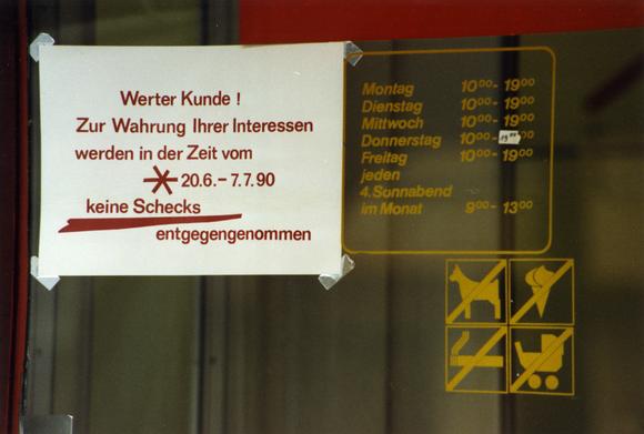 Werter Kunde! / Zur Wahrung Ihrer Interessen / werden in der Zeit vom / 20.6.-7.7.90 / keine Schecks / entgegengenommen