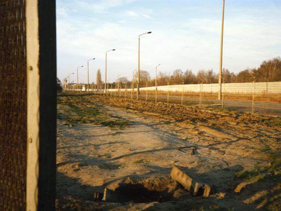 The former border strip; illumination strip, patrol road and the Hinterlandmauer (inner Eastern wall) to the right
