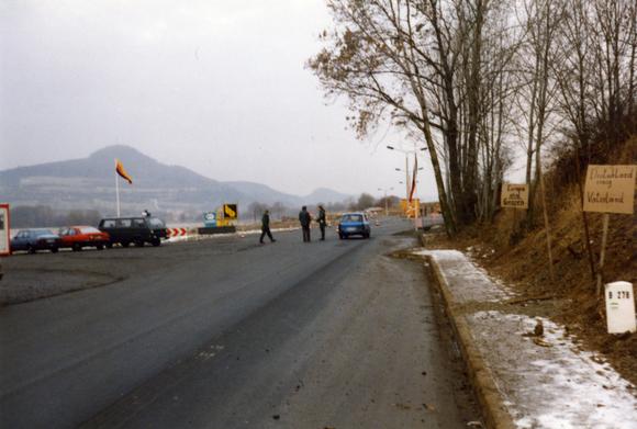 A Trabant traverses the newly opened border crossing between Günthers, a part of the Hessian city Tann on the Rhön river, and Motzlar, part of the town Schleid in Suhl district, now Thuringia