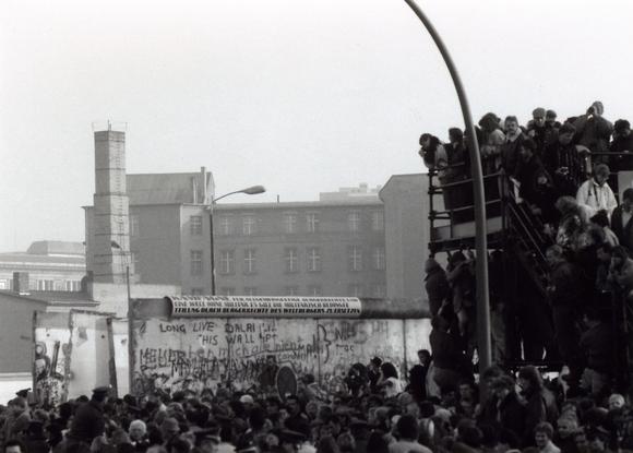 Menschenmenge auf der Westseite der Berliner Mauer bei der Öffnung des neuen Grenzübergangs Potsdamer Platz am 12. November 1989, im Hintergrund das Abgeordnetenhaus