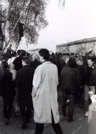 Menschenmenge auf der Westseite der Berliner Mauer bei der Öffnung des neuen Grenzübergangs Potsdamer Platz am 12. November 1989