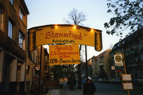 Bank (Finanzinstitut), Begrüßungsgeld, Begrüßungsgeschenk, Deutsche Mark, Handelsware, Konsum, Mauerfall, Skepsis, Stau, Trabant (Pkw)