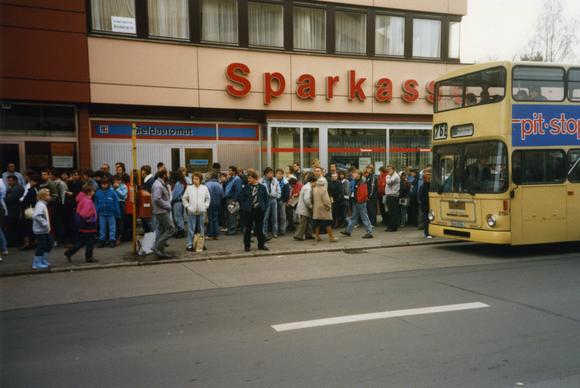 Vor einer Filiale der Sparkasse, in der Begrüßungsgeld ausgezahlt wurde.