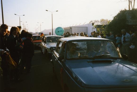 East German cars and pedestrians at Lichtenrade/Mahlow border crossing. Initially only open to garbage trucks belonging to Berlin waste removal services, the border crossing was opened to the public on November 10, 1989