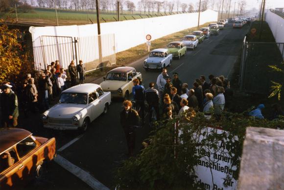 East German cars, police and pedestrians at Lichtenrade/Mahlow border crossing. Initially only open to garbage trucks belonging to Berlin waste removal services, the border crossing was opened to the public on November 10, 1989