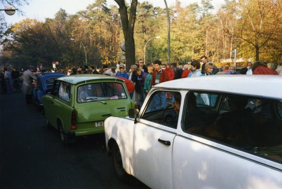 East German cars and pedestrians at Lichtenrade/Mahlow border crossing. Initially only open to garbage trucks belonging to Berlin waste removal services, the border crossing was opened to the public on November 10, 1989