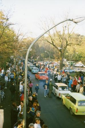 East German cars, police and pedestrians at Lichtenrade/Mahlow border crossing. Initially only open to garbage trucks belonging to Berlin waste removal services, the border crossing was opened to the public on November 10, 1989