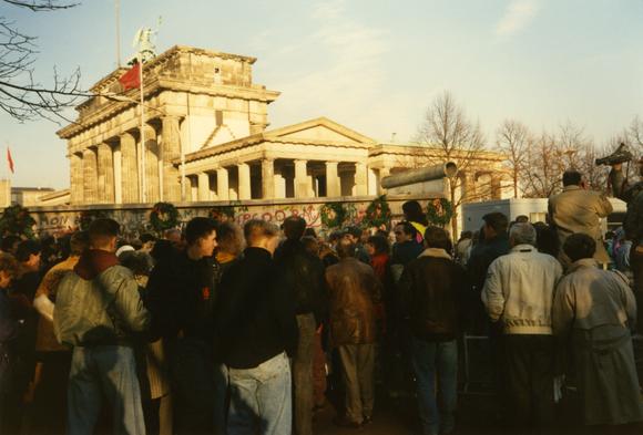 At the new border crossing at Brandenburg Gate, which was opened in a ceremony on 22 December 1989. Over 100,000 people and hundreds of camera teams attended the ceremony, presided over by Chancellor Helmut Kohl and Chairman of the GDR Council of Ministers, Hans Modrow.