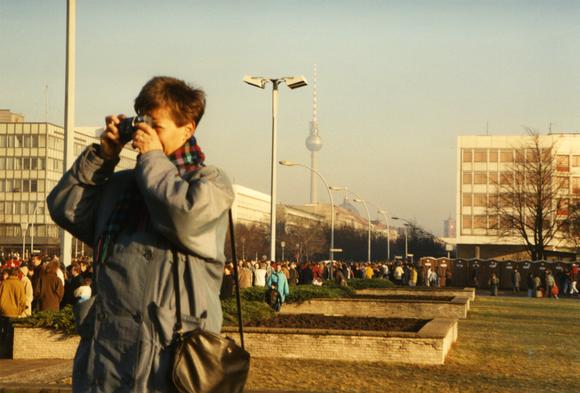 Menschenmenge auf der Straße Unter den Linden, im Hintergrund der Berliner Fernsehturm, die Kuppel des Berliner Doms und das Rote Rathaus