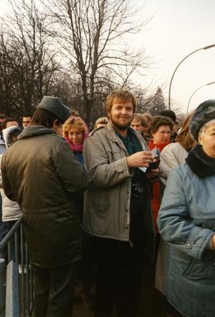 At the new border crossing at Brandenburg Gate, which was opened in a ceremony on 22 December 1989. Over 100,000 people and hundreds of camera teams attended the ceremony, presided over by Chancellor Helmut Kohl and Chairman of the GDR Council of Ministers, Hans Modrow.