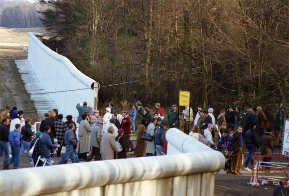 Menschen überqueren den am 17. Februar 1990 eingerichteten Grenzübergang Berliner Straße (Hohen Neuendorf)/Oranienburger Chaussee (Frohnau)