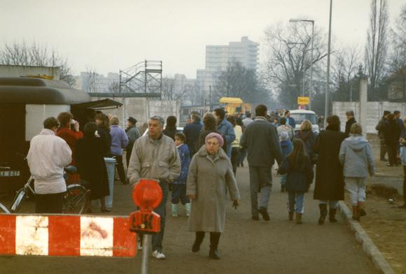 People inside the former border strip at the Karl-Marx-Straße border crossing (Großziethen)/Buckower Damm (Buckow), that was installed on 3 January 1990