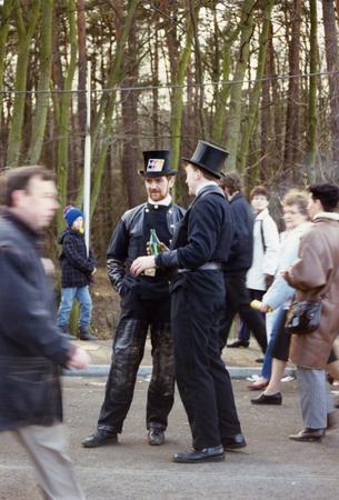 Schornsteinfeger und Passanten am Grenzübergang Berliner Straße (Hohen Neuendorf)/Oranienburger Chaussee (Frohnau), der am 17. Februar 1990 eingerichtet wurde
