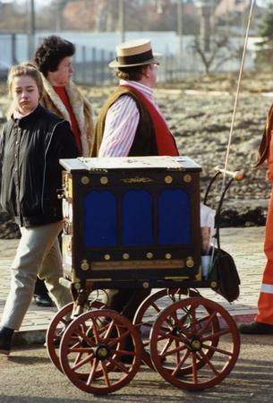 A man with a barrel organ at the opening of the Berliner Straße border crossing (Hohen Neuendorf)/Oranienburger Chaussee (Frohnau) on 17 February 1990