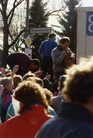 Mitarbeiter der Co op AG verteilen Werbegeschenke an Passanten anlässlich des Straßenfestes zur Öffnung des Grenzübergangs Oranienburger Chaussee (Glienicke/Nordbahn)/Berliner Straße (Hermsdorf) am so genannten "Entenschnabel", dem westlichen Ende der Straße Am Sandkrug in der brandenburgischen Gemeinde Glienicke/Nordbahn, die schnabelartig in das Berliner Gebiet hinein reicht