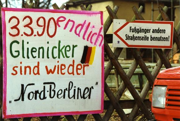 "Glienicker sind wieder 'Nord Berliner'" ("Glienicke residents are finally 'North Berliners' once again"). A handmade sign on the occasion of the opening of the Oranienburger Chaussee border crossing (Glienicke/Nordbahn)/Berliner Straße (Hermsdorf) at the so-called "Entenschnabel" ("duck's bill"), the western end of the Straße Am Sandkrug in the Brandenburg borough of Glienicke/Nordbahn (that reached into the Berlin territory in the shape of a duck's bill).