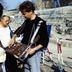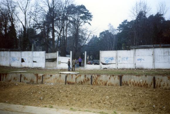 A border guard and pedestrians at the severely demolished Hinterlandmauer (inner Eastern Wall) inside the former border strip in Berlin-Mahlow