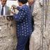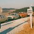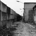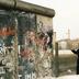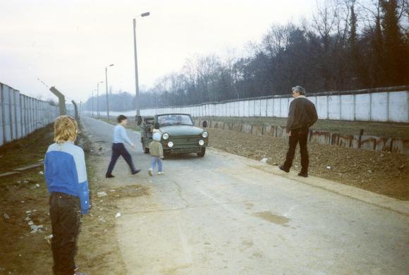 Pedestrians and a car belonging to East German border troops on the patrol road inside the former border strip; the East side of the Berlin Wall on the right; the Hinterlandmauer (inner Eastern wall) with remnants of the border security fence to the left