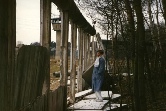 A view of the former border strip and a watchtower as seen through gaps in the severely demolished Berlin Wall