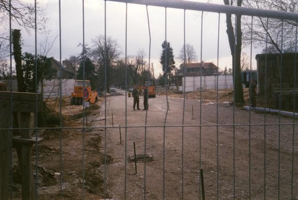 Construction work inside the former border strip; fragments of the Berlin Wall in the foreground to the right; the white Hinterlandmauer (inner Eastern wall) in the background