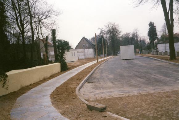 Neu angelegte Straße mit Fußweg im ehemaligen Grenzstreifen, im Hintergrund Fragmente der Hinterlandmauer