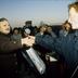 Menschen mit Transparent beim Straßenfest anlässlich der Öffnung des Grenzübergangs Oranienburger Chaussee (Glienicke/Nordbahn)/Berliner Straße (Hermsdorf) am so genannten "Entenschnabel", dem westlichen Ende der Straße Am Sandkrug in der brandenburgischen Gemeinde Glienicke/Nordbahn, die schnabelartig in das Berliner Gebiet hineinreicht