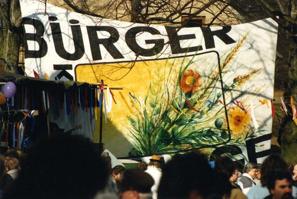 A banner at the street party held for the opening of the border crossing at Oranienburger Chaussee (Glienicke/Nordbahn)/Berliner Straße (Hermsdorf) at the so-called "Entenschnabel" ("duck's bill"), the western end of the Straße Am Sandkrug in the Brandenburg borough of Glienicke/Nordbahn (that reached into the Berlin territory in the shape of a duck's bill).