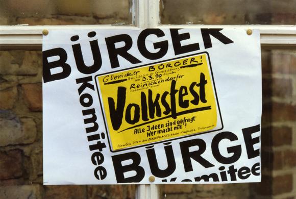 Glienicker Bürger! / Anlässlich der Grenzöffnung / am 3.3.90 begrüßen / wir unsere / Reinickendorfer / Nachbarn mit einem / Volksfest / Alle Ideen sind gefragt / Wer macht mit? / Hinweise bitte in den Briefkasten in der Kaufhalle Thälmannstr