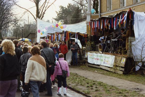 Menschenmenge beim Straßenfest anlässlich der Öffnung des Grenzübergangs Oranienburger Chaussee (Glienicke/Nordbahn)/Berliner Straße (Hermsdorf) am so genannten "Entenschnabel", dem westlichen Ende der Straße Am Sandkrug in der brandenburgischen Gemeinde Glienicke/Nordbahn, die schnabelartig in das Berliner Gebiet hineinreicht