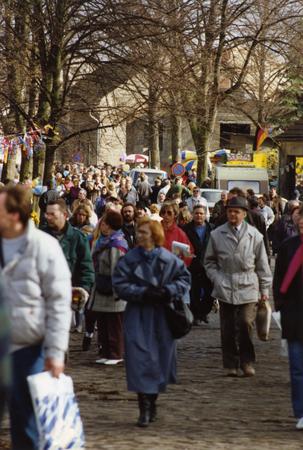 Menschenmenge beim Straßenfest anlässlich der Öffnung des Grenzübergangs Oranienburger Chaussee (Glienicke/Nordbahn)/Berliner Straße (Hermsdorf) am so genannten "Entenschnabel", dem westlichen Ende der Straße Am Sandkrug in der brandenburgischen Gemeinde Glienicke/Nordbahn, die schnabelartig in das Berliner Gebiet hineinreicht
